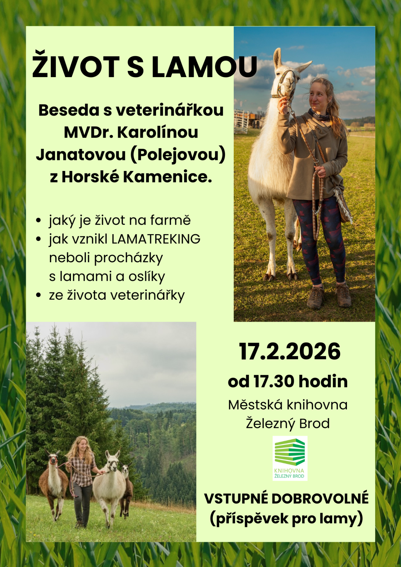V úterý 17.2.2026 od 17:30 vás zveme na besedu s veterinářkou MVDr. Karolínou Janatovou (Polejovou) z Horské Kamenice. Dozvíte se, jak se žije na farmě, jak vznikl Lamatrejking (procházky s lamami a s oslíky) a zajímavosti ze života veterinářky.