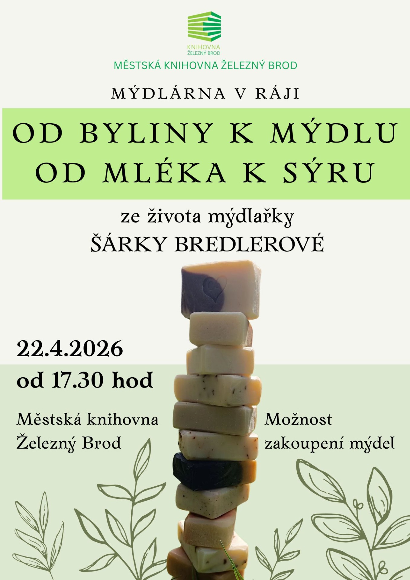 Ve středu 22. 4. 2026 v 17:30 h. přivítáme v naší knihovně Šárku Bredlerovou z Malé Skály. V rámci besedy bude možnost i zakoupení mýdel. Sama Šárka o sobě na svém webu píše: "Jsem úplně obyčejná holka, máma 5 báječných dětí a žena báječnýho chlapa.