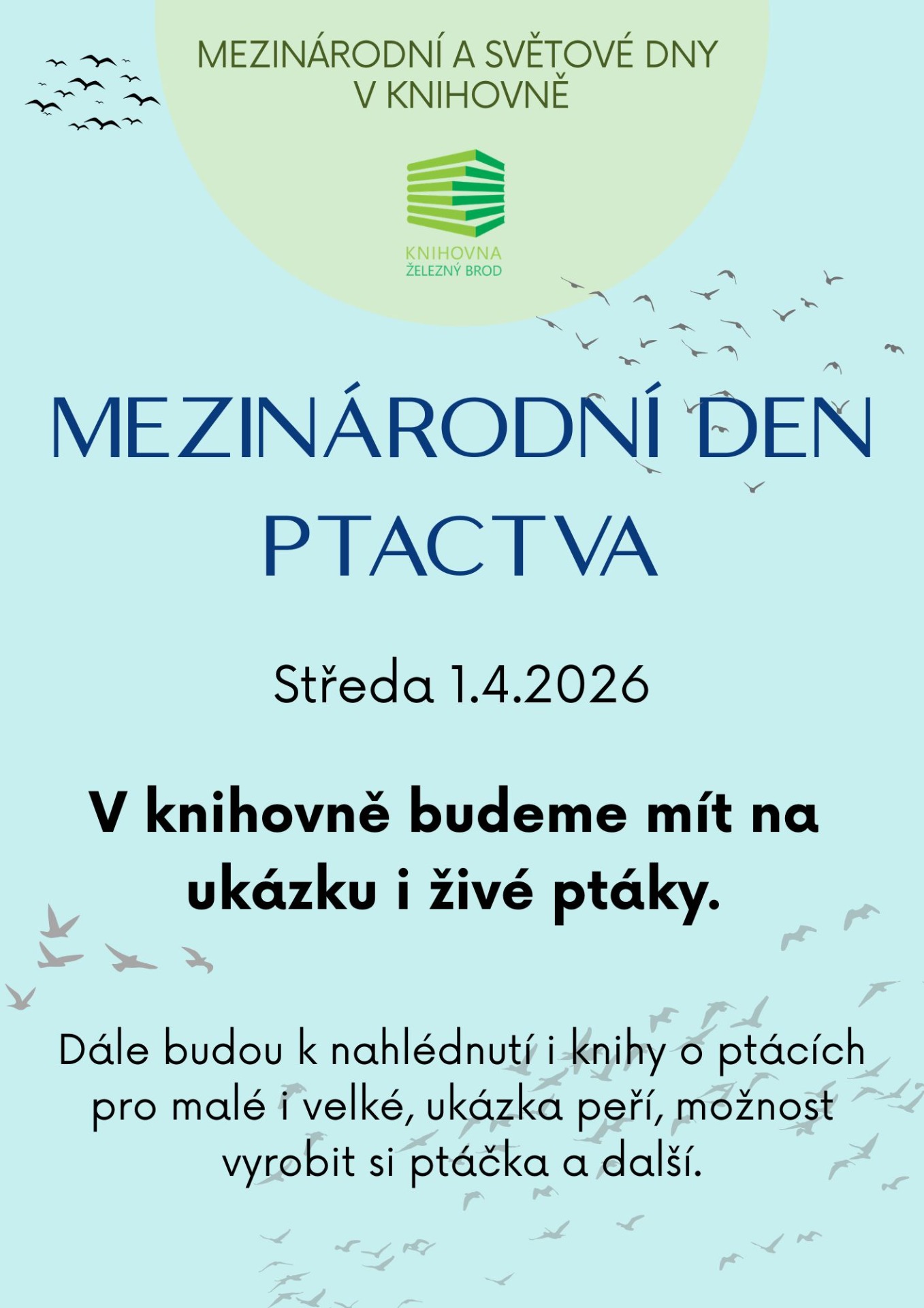 Další mezinárodní den, který s námi můžete oslavit v knihovně, je Mezinárodní den ptactva a to již prvního dubna. Celou středu budou pro Vás připraveny knížky o ptácích, ukázka peří ptáků, dokonce i živí zástupci ptačí říše, nejen děti si budou moci vyrobit ptáčka na památku atd.